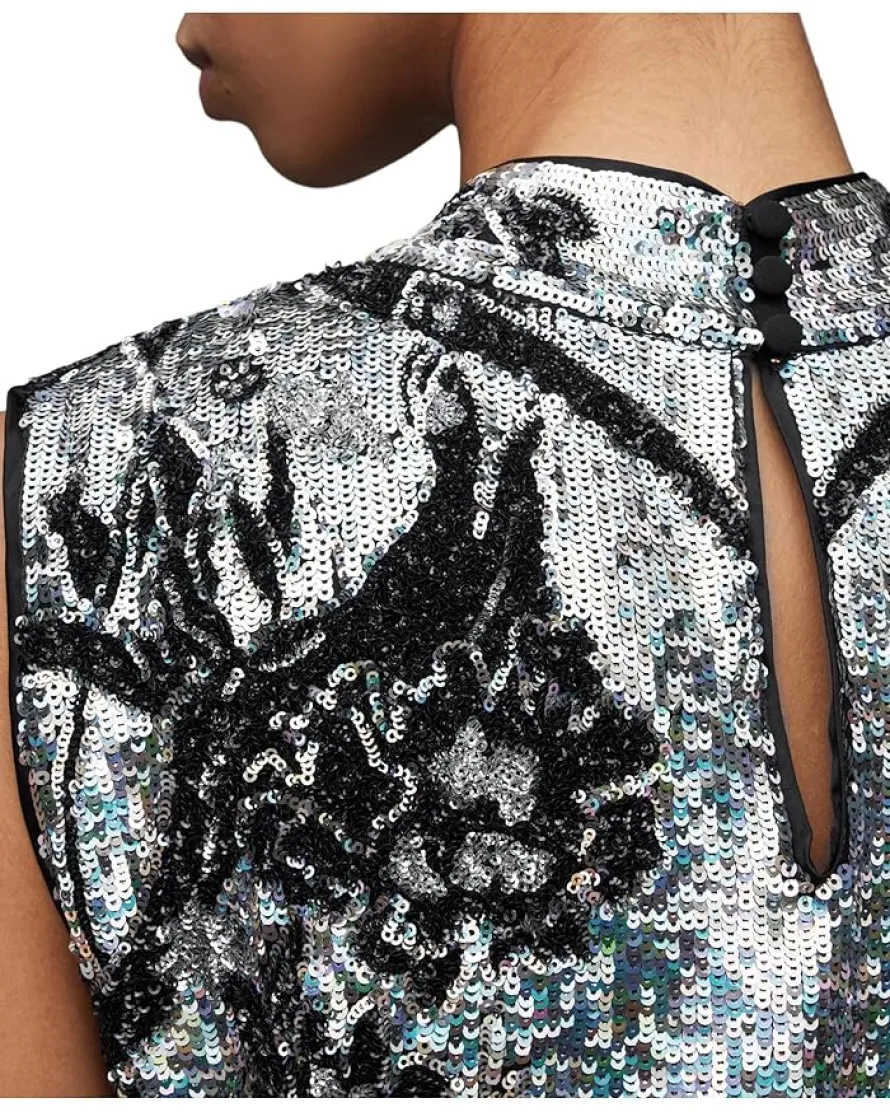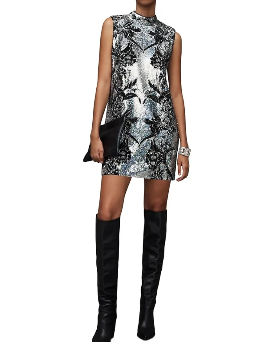 - Strike a confident and glamorous pose in the embellished AllSaints™ Harper Mini Embroidered Dress rendered from a dramatically silver and floral-shaped beading. The straight mini-length silhouette features a funnel neckline and sleeveless construction with a straight hemline.
