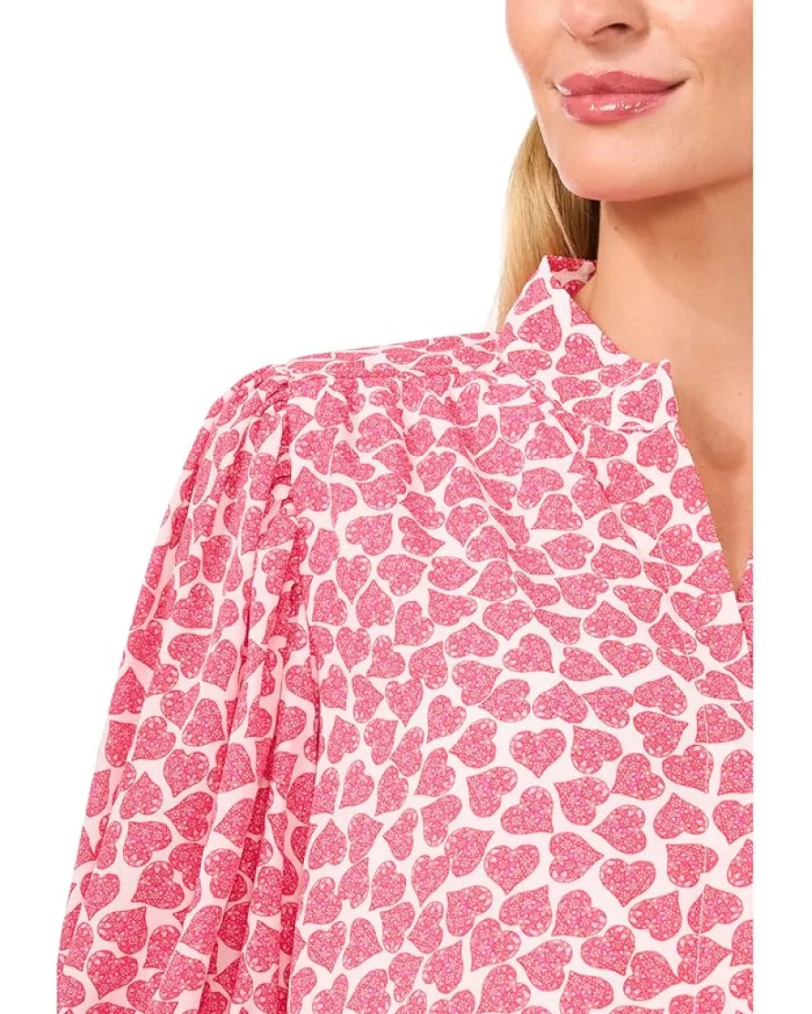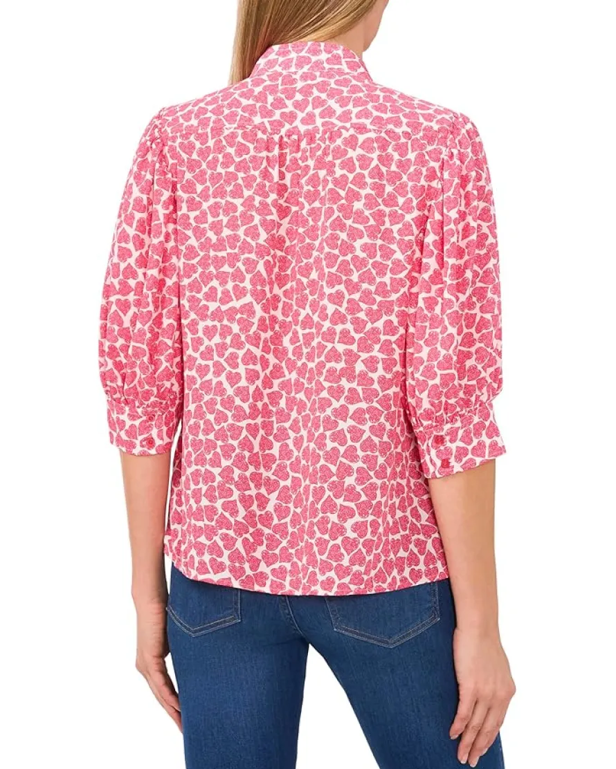 - Modern romance: The CeCe™ Heart Ruched Sleeve Hidden Placket Blouse. Crafted from heavy georgette for a luxurious drape, this blouse features a whimsical heart pattern that brings joy to any outfit. The hidden button placket ensures a polished, seamless look, while ruched quarter sleeves add a touch of romantic flair.