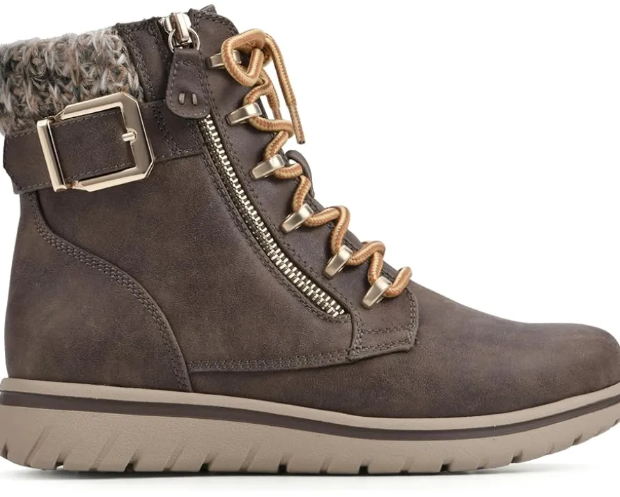 - Explore urbane streets wearing the fashionable Cliffs™ by White Mountain® Hearten Lace-Up Boots. This lightweight footwear features textile upper construction with buckle-accented ankle, zippered side closure, and a round toe silhouette.