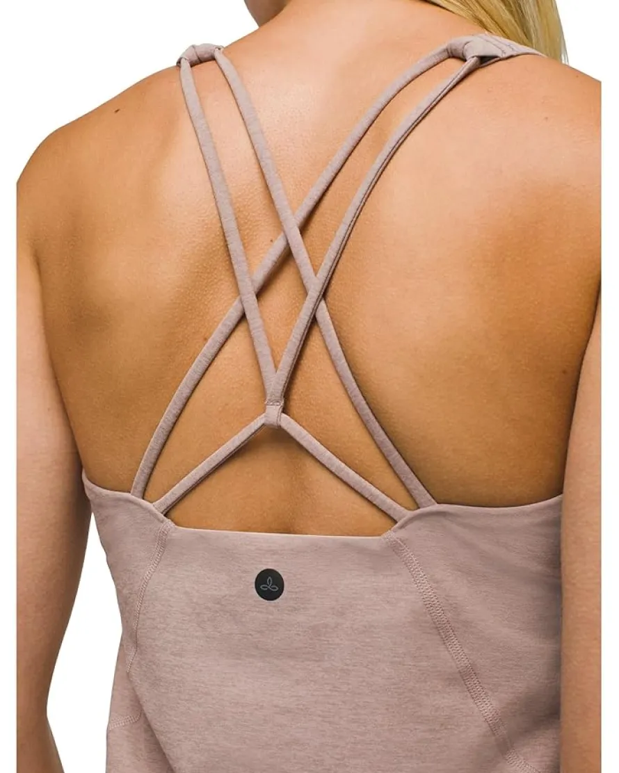 - Embrace your chic appeal by donning Prana® Heavana Every Day Dress that comes in a heavana® recycled polyester blend jersey construction with double side carbonized peach for buttery soft hand feel, ultimate upf 50+ protection, and a moisture wicking quality for enhanced comfort. The dress features v-neck support with novelty back straps, clean finish construction at armholes and neck line, interior shelf bra with mesh lining and plush elastic, removable modesty cups, and prana® logo heat transfer at center back.