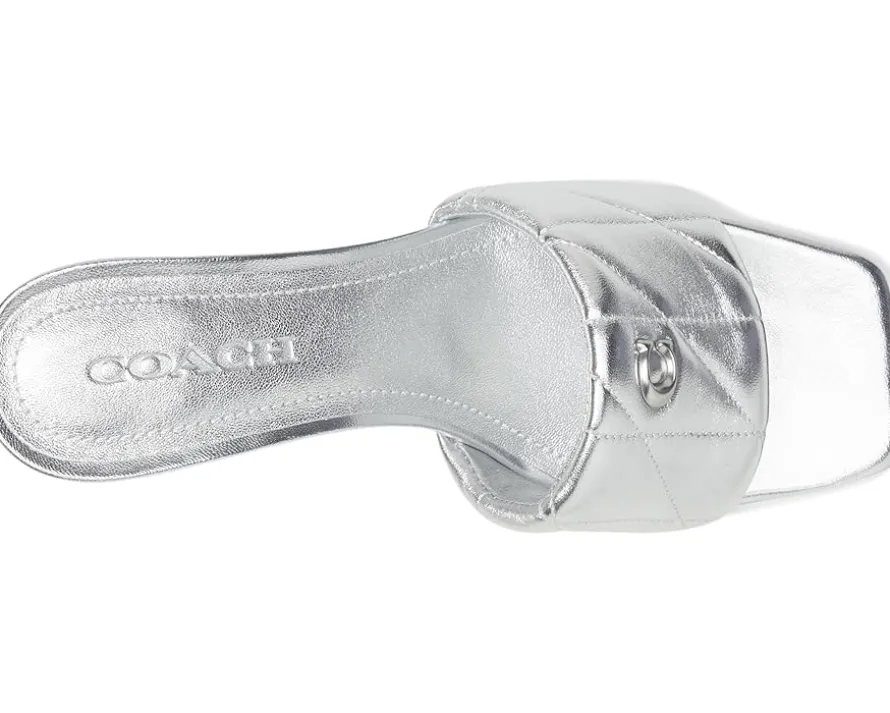 - Strut in confidence wearing the COACH® Holly Block Heel Sandals with Quilting. Crafted from leather upper, man-made leather lining, and leather insole, this pair of sandals features open square toe, quilted wide strap on the vamp with gold-tone logo emblem, slip-on style, block heel, and brand detailing on the footbed.