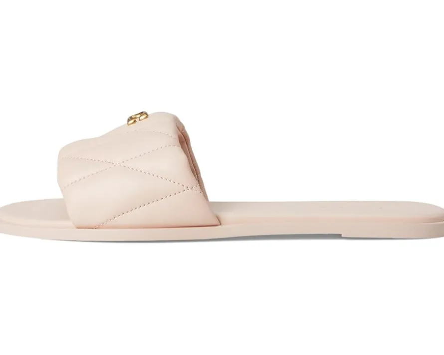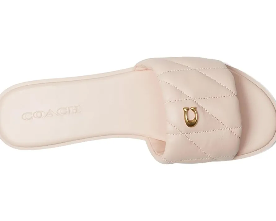 - Enjoy the barefoot freedom wearing the COACH® Holly Sandals with Quilting. Crafted from leather upper, man-made leather lining, and rubber insole, this pair of sandals features open round toe, low heel, quilted wide strap on the vamp with gold-tone logo emblem, slip-on style, and brand detailing on the footbed.