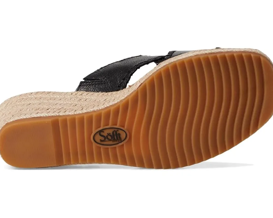 - The Sofft® Indie is here with its X-band slide design and intricate whip-stitching detail. The espadrille style adds a touch of rustic charm, while the wrapped rope wedge mid-heel provides a flattering lift.