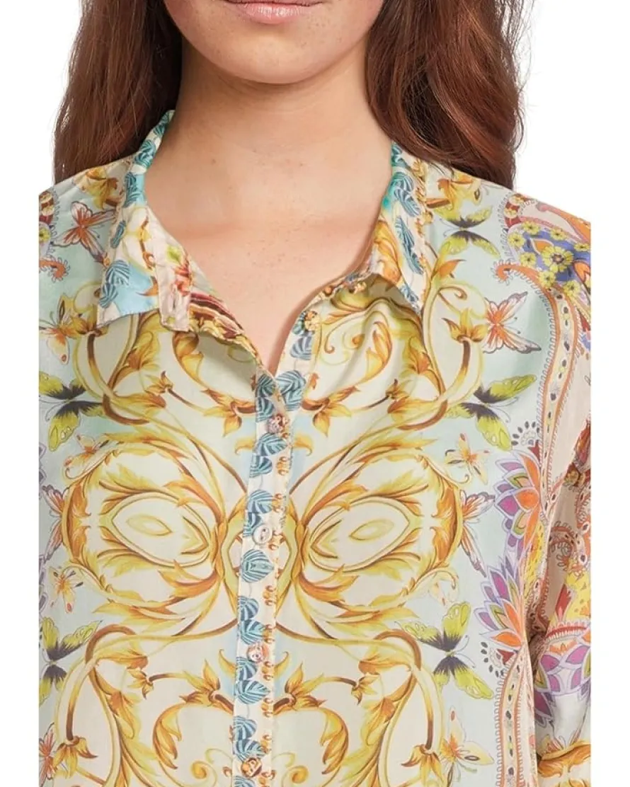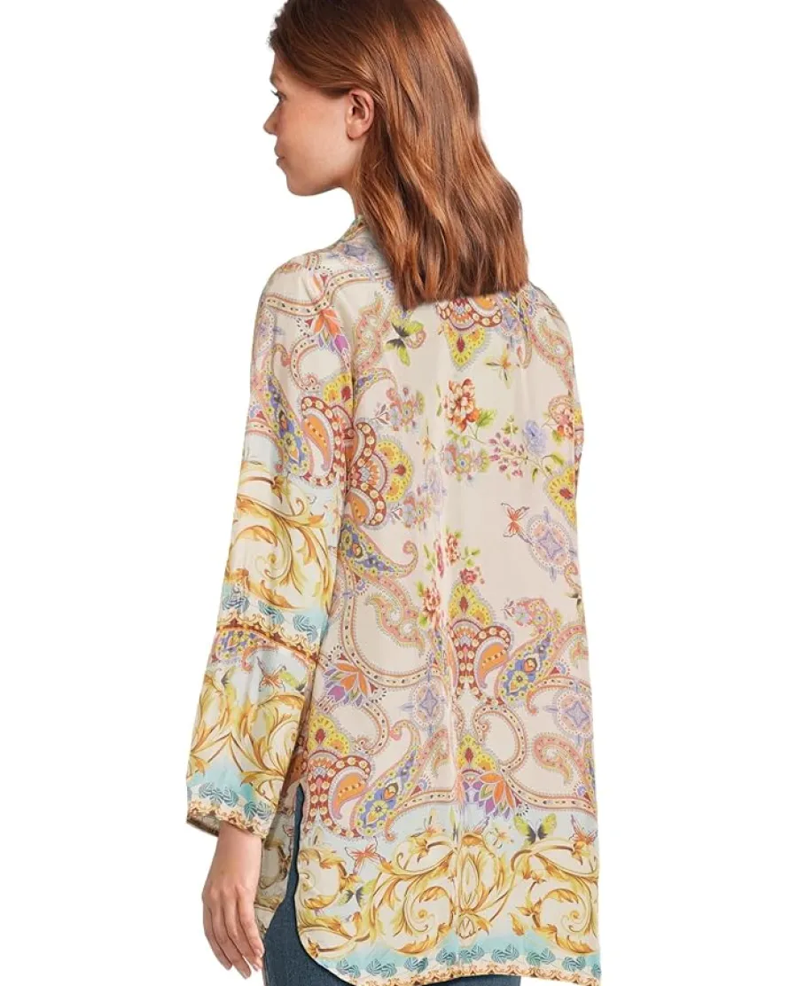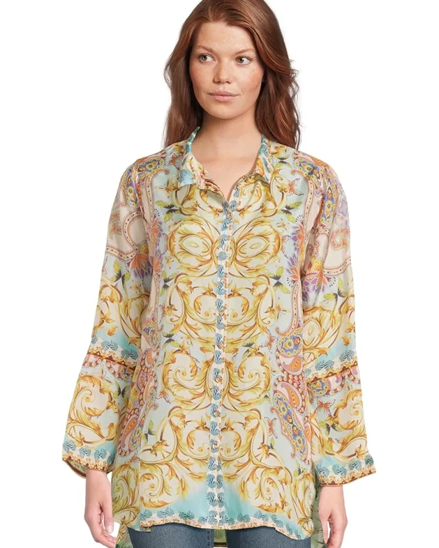 - Bold, vibrant, and effortlessly chic-the Johnny Was® Indy Tunic is a true statement piece! Designed with an oversized fit for a relaxed yet sophisticated silhouette, this tunic blends striking color combinations with timeless elegance. The collared neck and button-front closure add a touch of structure, while the long sleeves enhance its versatile, seasonless appeal. Crafted for comfort, its flowy fabric drapes beautifully, making it perfect for layering or wearing solo.