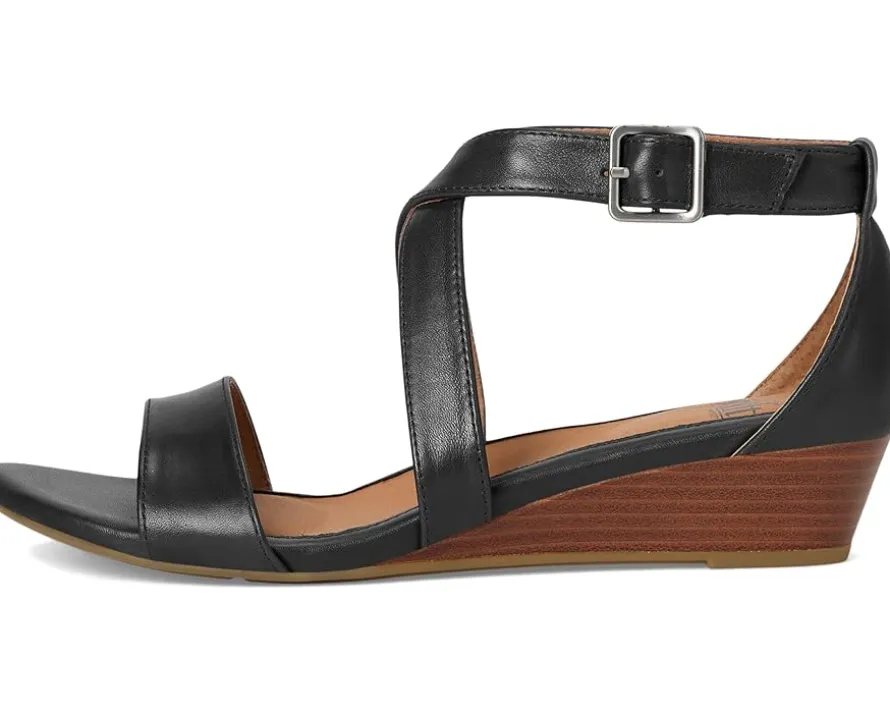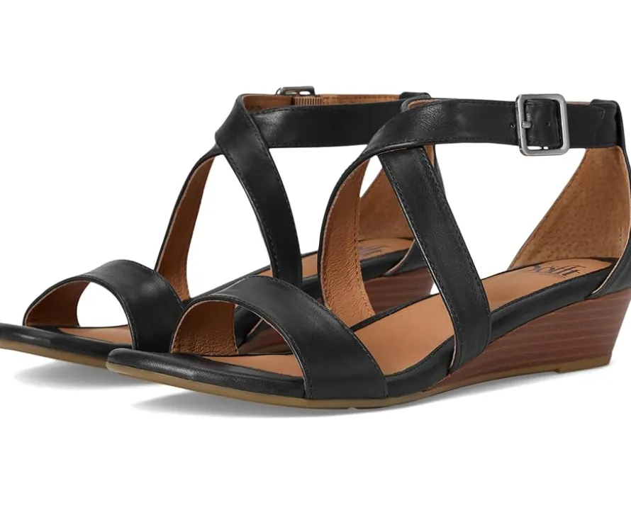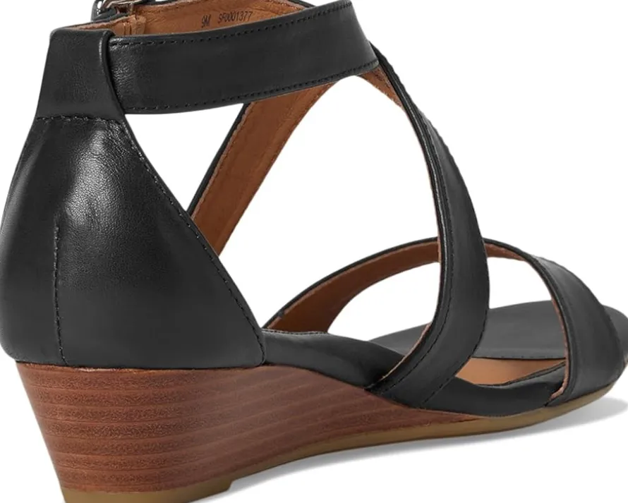 - Strappy suede or patent uppers in a sandal wedge silhouette.