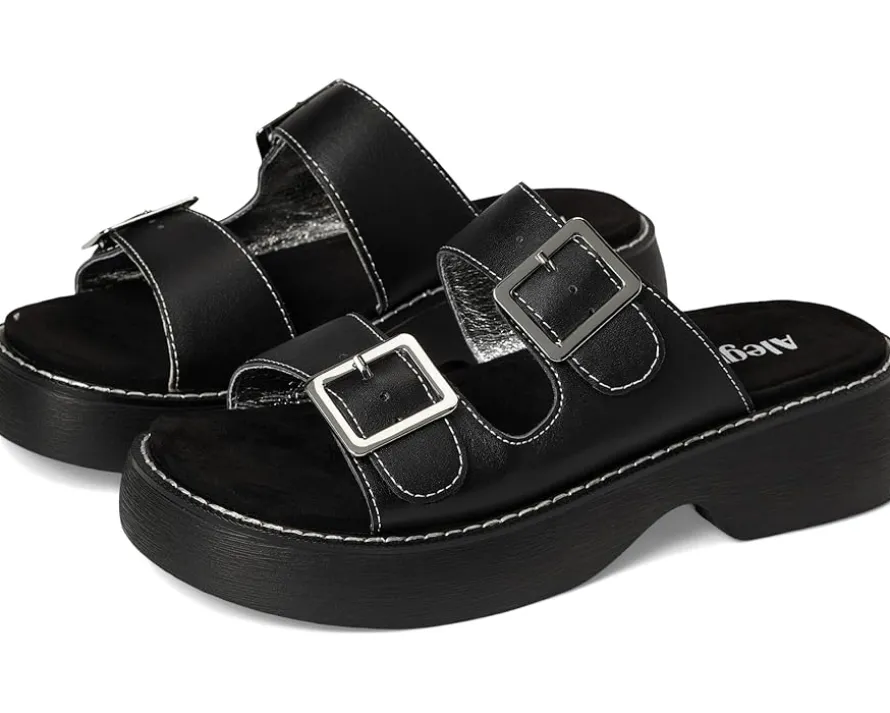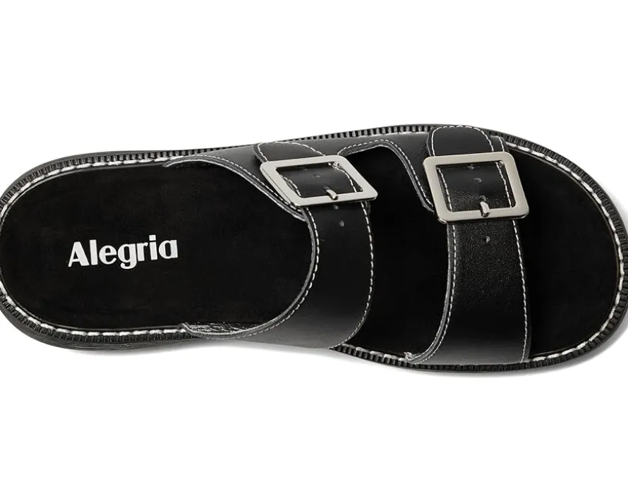 - Support meets style, seamlessly wearing the Alegria® Iza slip-on sandal. Crafted with a premium leather upper and lining, this sleek design wraps your feet in breathable luxury. The double-strap silhouette, featuring adjustable buckle closures, ensures a customized fit while adding a modern touch to your look. A soft faux leather insole cradles your feet, offering lasting comfort, while the lightweight PU outsole delivers superior flexibility and durability.