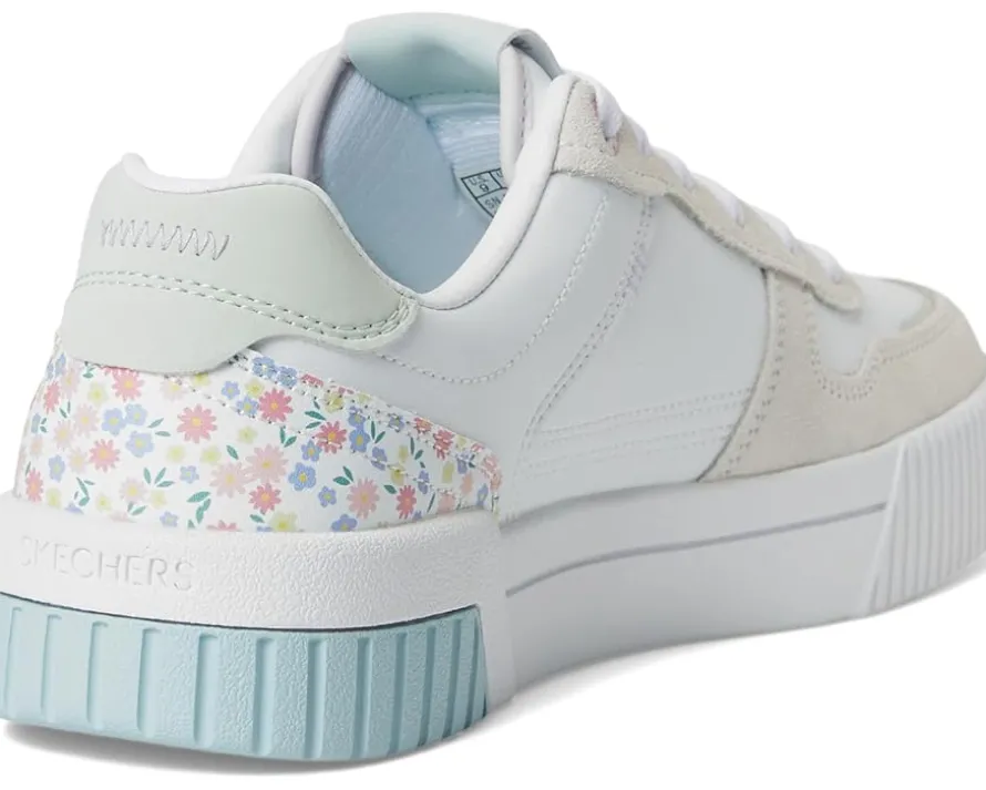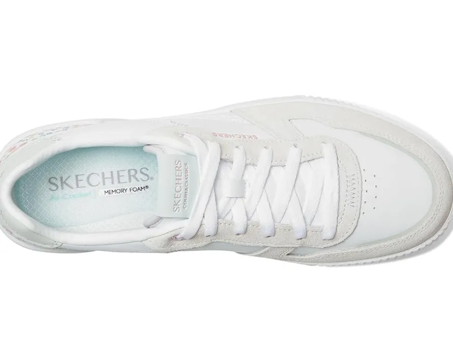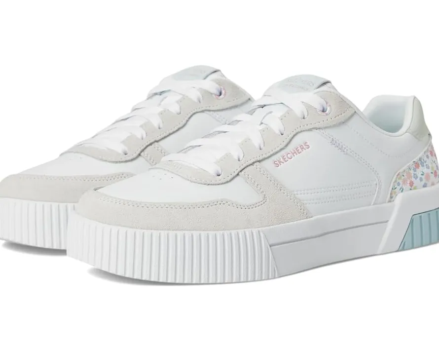 - Enjoy perfectly styled court comfort wearing the SKECHERS® Jade sneakers. This low-top lace-up features, a Molded rubber cupsole, and a Skechers Air-Cooled Memory Foam® cushioned comfort insole. The court style sneakers have duraleather and genuine suede overlay upper with floral print heel cup and polyester lining.