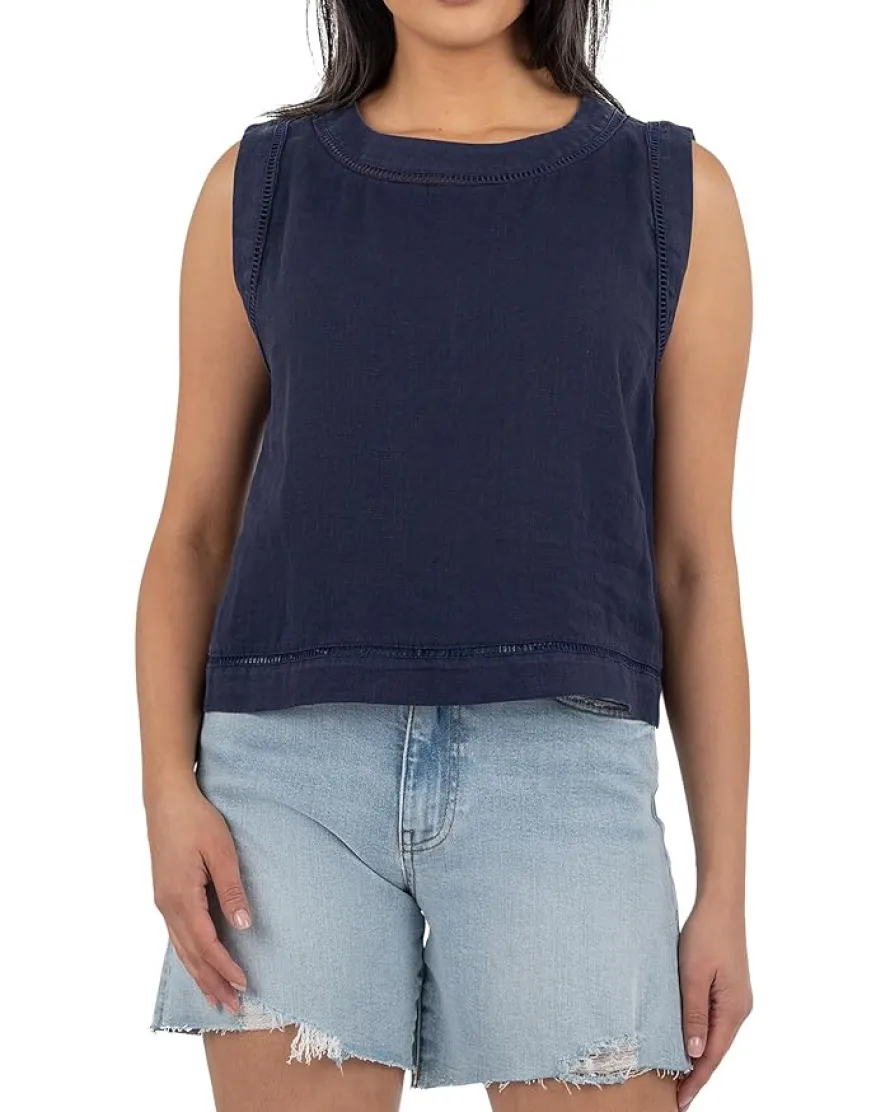 - Style that speaks volumes – KUT from the Kloth™ Joanne Sleeveless Top. Designed in a regular fit with a sleek, modern silhouette, it features a chic boat neckline enhanced with a trim sandwich detail for an elevated twist. A keyhole back adds just the right touch of allure, while the pull-on design keeps things easy-breezy. Sleeveless for endless layering or sun-soaked styling, and cropped to perfection, this top pairs seamlessly with high-rise denim, flowy skirts, or tailored shorts.