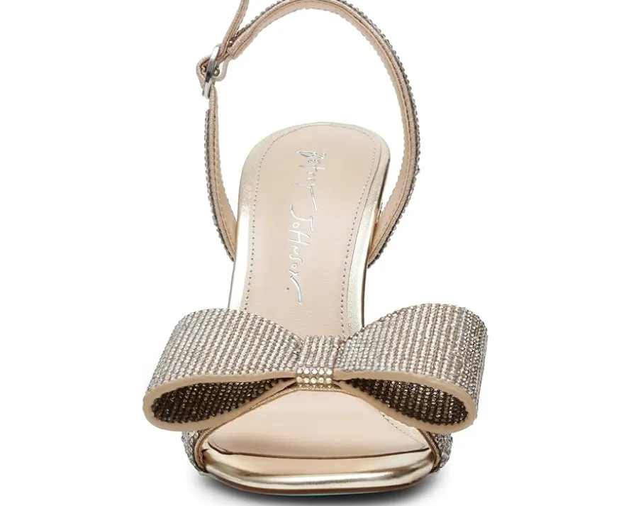 - The Blue™ by Betsey Johnson Joel heels add a playful and feminine touch to any outfit, featuring a bow at the toe strap and dazzling embellishments all around! Made with synthetic rubber upper and lining, these trendy sandals are perfect for adding a touch of glamor to any outfit.