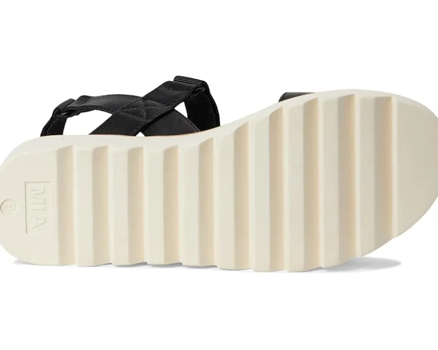 - Channelize your inner diva wearing the MIA™ Jony. Crafted from faux leather upper, lining, and insole, this pair of sandals features open round toe, adjustable ankle strap with hook-and-loop closure, ridged sole for extra flexibility and support, platform heel, and brand detailing on the footbed.