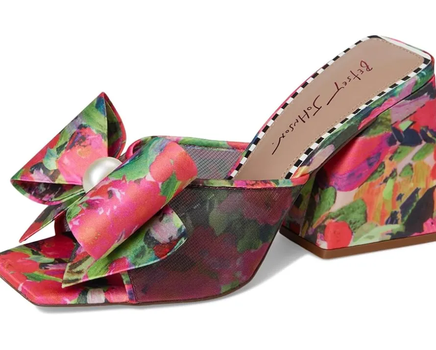 - Perfect for every fashionista, the Blue™ by Betsey Johnson Jordn is girly and bright with its floral design and bow adornment. The slip-on pair features a squared open toe silhouette and flared block heel.