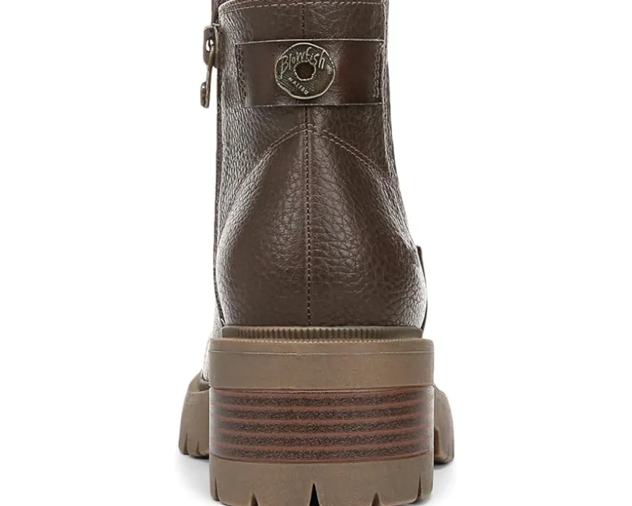 - The ankle-high Blowfish® Malibu Joy Booties feature a side stretch panel and inside zipper for easy entry. Designed with round toe shape and an aggressive lug sole, the boot stands on a stacked block heel. The faux leather upper construction accompanies a sleek hardware detail at the back.