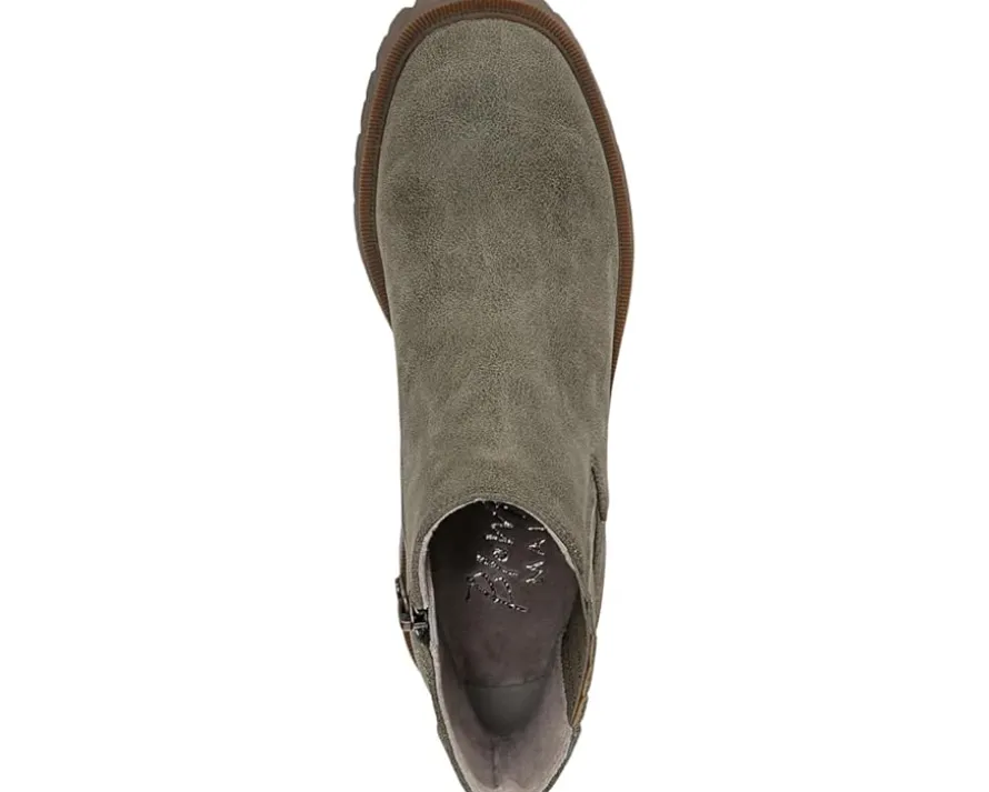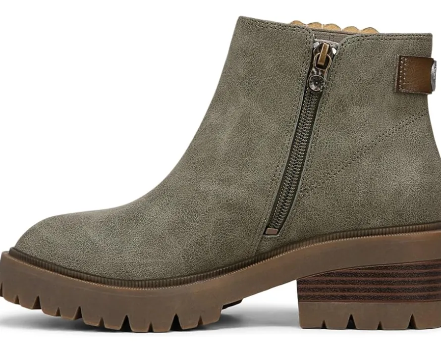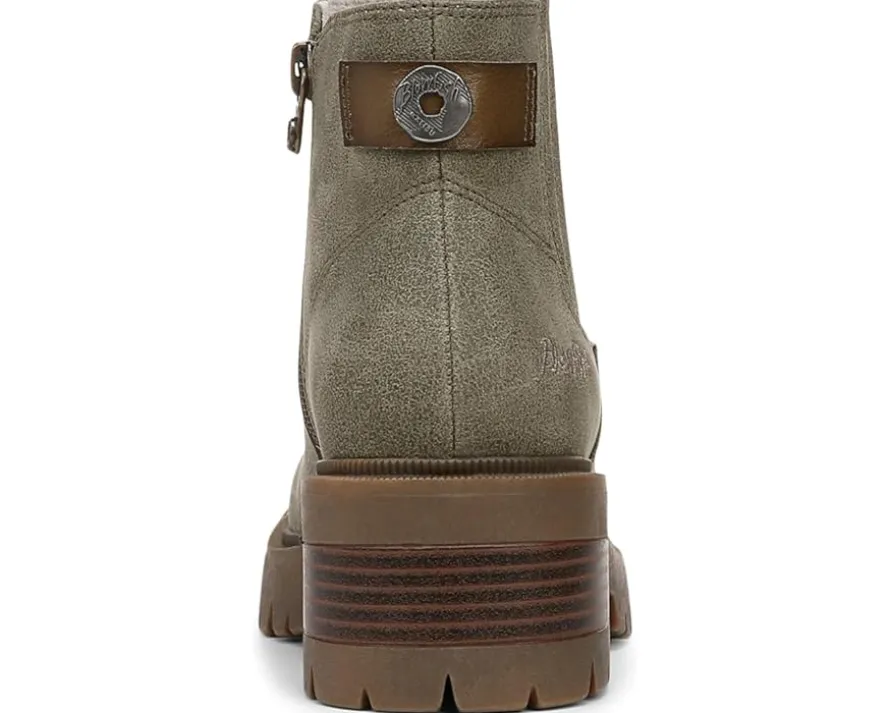 - The ankle-high Blowfish® Malibu Joy Booties feature a side stretch panel and inside zipper for easy entry. Designed with round toe shape and an aggressive lug sole, the boot stands on a stacked block heel. The faux leather upper construction accompanies a sleek hardware detail at the back.