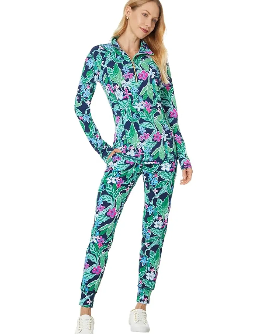 - Pair your sports shoes for outdoors by getting this modern Lilly Pulitzer® Justine Half Zip Upf 50+ top. The high collar spreads when open through half-front zip. The skinny-fit top has long sleeves and a shirttail hem. An allover floral print makes it outstanding. The top features shirring on the shoulder. Moisture-wicking construction keeps you dry throughout the day.