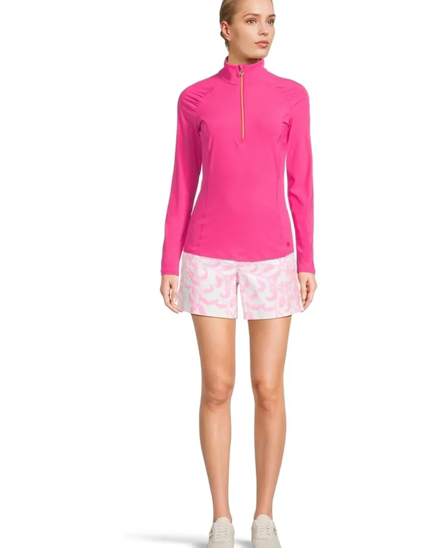 - Pair your sports shoes for outdoors by getting this modern Lilly Pulitzer® Justine Half Zip Upf 50+ top. The high collar spreads when open through half-front zip. The skinny-fit top has long sleeves and a shirttail hem. An allover floral print makes it outstanding. The top features shirring on the shoulder. Moisture-wicking construction keeps you dry throughout the day.