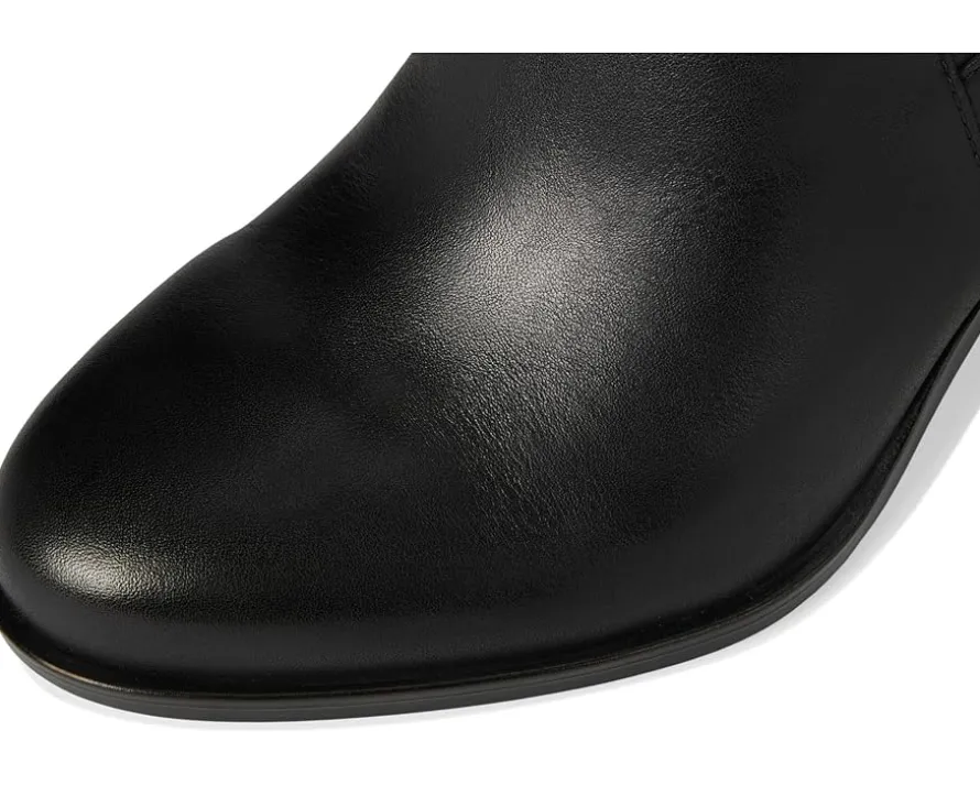 - Sleek heeled knee high boot with goring panel and decorative buckle.