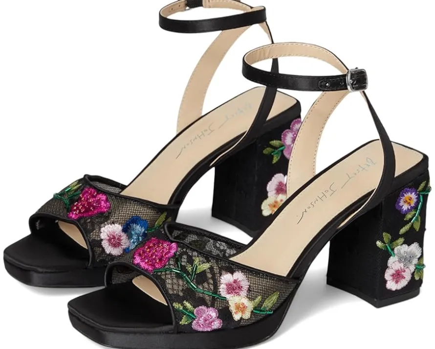 - Bold and romantic, the Blue™ by Betsey Johnson Kenni heels feature floral embroidery on a statement platform. These heeled sandals are designed with a faux leather upper, insole, and lining. The adjustable ankle strap ensures a secure fit. With a secure fit and cushioned comfort, these embroidered sandals are made to turn heads day or night.