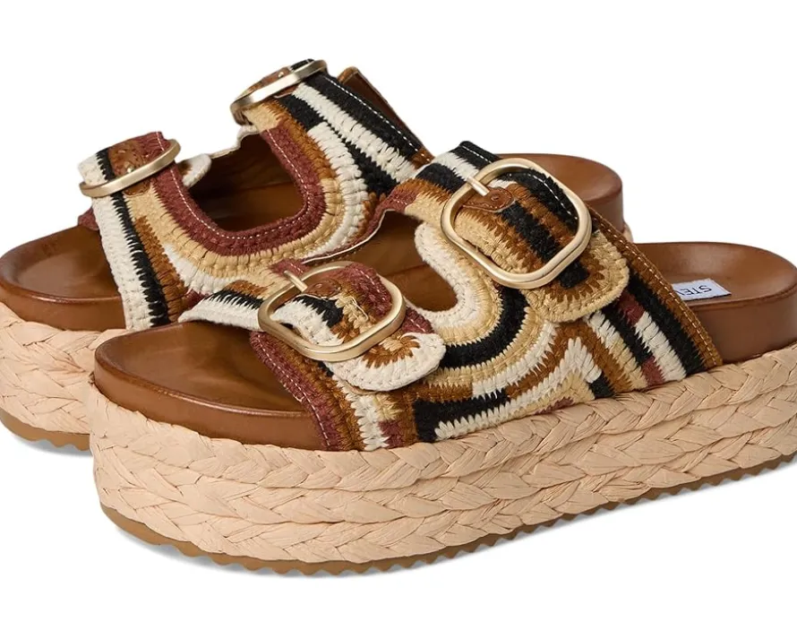 - Embrace your inner free spirit with the Steve Madden® Klare sandal. This playful design features vibrant embroidered straps and a chunky woven platform sole for a touch of bohemian flair. These slip-on style sandals are designed with a cotton upper, faux leather lining, and faux leather insole. Whether you’re strolling through a bustling city or relaxing on a sunny beach, the Klare sandal will add a touch of fun and personality to your look.