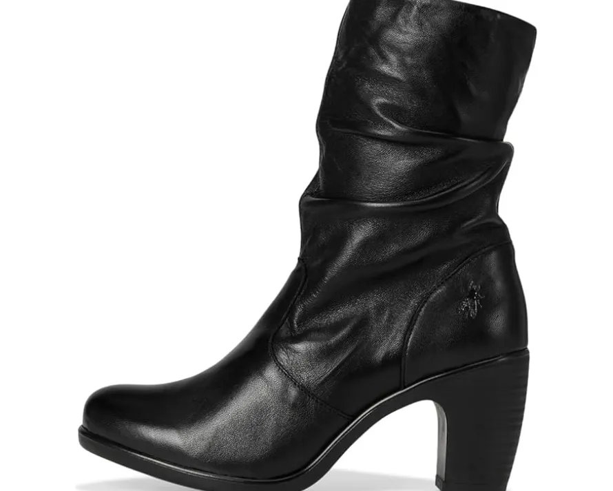 - The supple, ruched leather or suede uppers have an inside zipper making this FLY LONDON® KLEI152FLY mid-calf boot easy to get on and off. Its heel-to-toe foam insole, rounded toe shape, and flexible rubber outsole all work together to surround your feet in comfort.