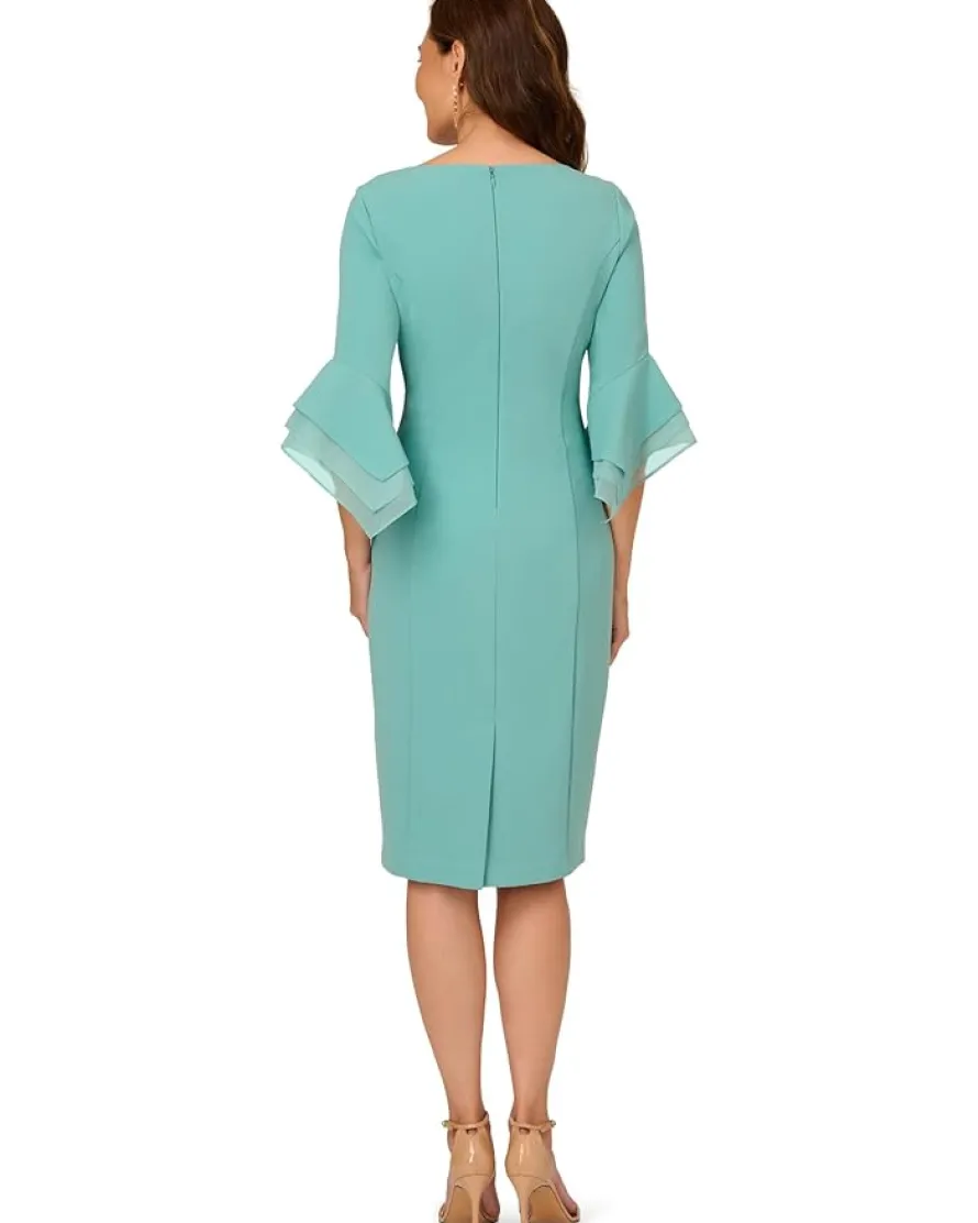 - Elegance redefined with the Adrianna Papell® Knit Crepe Tiered Sleeve Dress. Embrace timeless sophistication in this midi marvel with a boat neckline, fitted silhouette, and tiered bell sleeves. Crafted from knit crepe for comfort and stretch, featuring a zipper back closure, no waist seam, and a single pleat. Solid pattern, bow embellishment, quarter sleeves − redefine your style effortlessly.