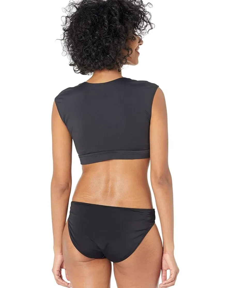 - You’re ready for the pool or beach in the Bleu Rod Beattie® Kore Tie Front Cap Sleeve Crop Top with Removable Cups, providing shoulder and back coverage with a modern, flattering look.