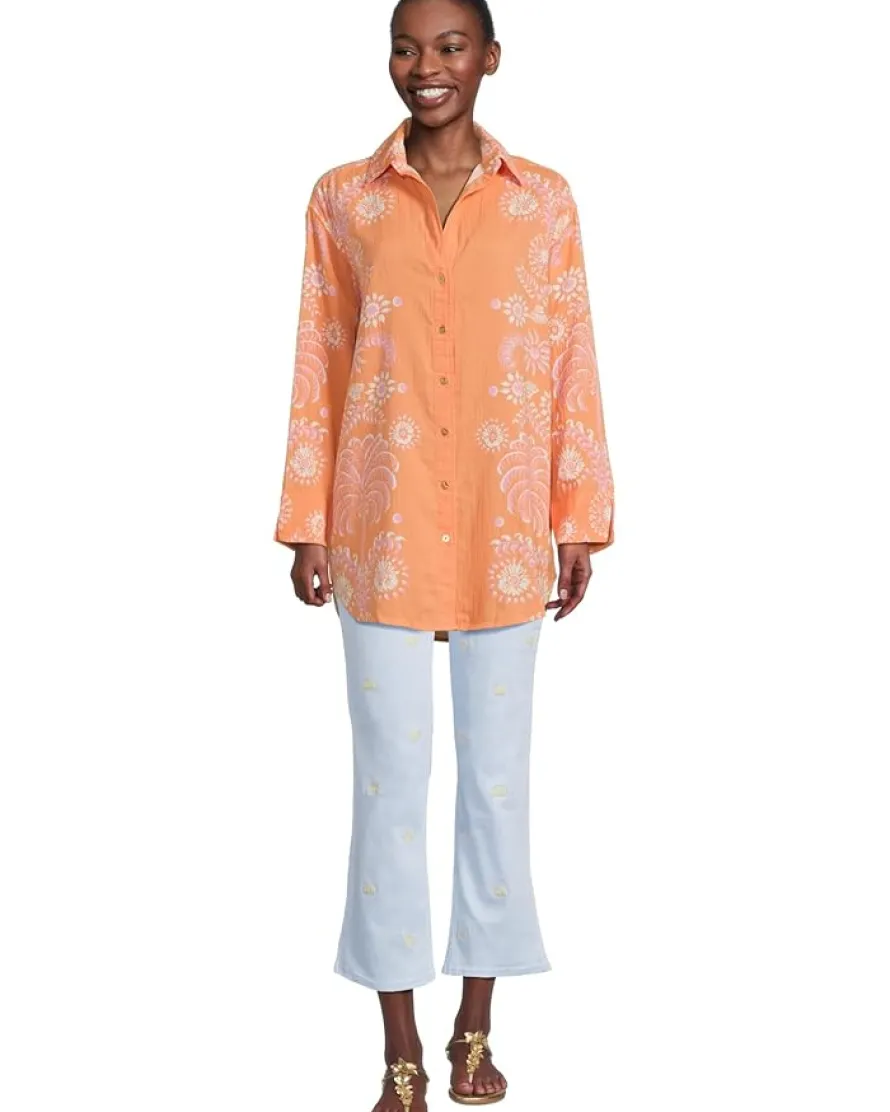 - Breezy, bold, and beautiful: The Lilly Pulitzer® Kwitney Long-Sleeve Cover-Up. This relaxed-fit cover-up is easy to layer for an endless variety of looks due to its classic collared neckline and button-front closure. The light fabric falls beautifully over the skin to keep you cool and comfortable while lounging at the pool or walking the shore. Its signature floral print makes it great for a day at the beach or a brunch by the water.