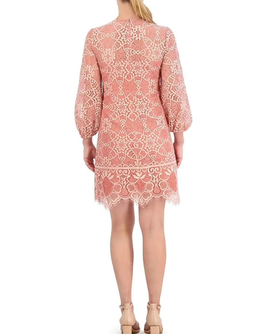 - Get ready to grab all the attention around you as you step into the party wearing the Vince Camuto® Lace Shift Dress. Fitted through the chest and arms and slightly loose through the waist and hips, this dress looks elegant with its jewel neckline, flowy elbow-length sleeves, and scalloped trims. The delicate and textured lace detailing throughout further beautifies this piece.
