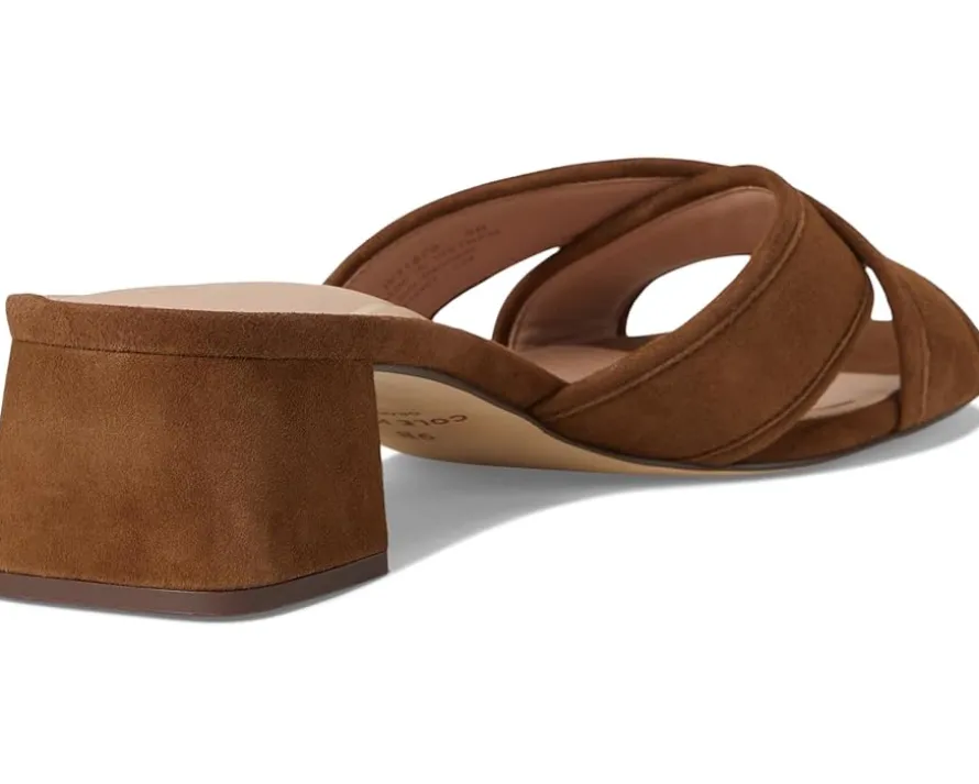 - The Cole Haan® Landon Sandals 40mm are designed in a mule sandal silhouette with flared block heels. Their cross-band leather upper is styled with piping detail. These heeled sandals are made of a 3D Lux comfort EVA insole and are leather-lined for added comfort. The buffed EVA outsole contains 32% recycled rubber content with a weave laser design at the forepart for traction.