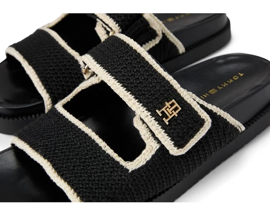 - The Tommy Hilfiger® Landyn isn’t just a sandal-it’s a statement. Featuring an elegant PU upper and woven crochet straps, it brings hand-crafted vibes to your warm-weather wardrobe. Signature Tommy hardware adds a polished pop, while the polyester lining keeps things smooth and breathable. Step into all-day comfort with a contoured leather insole that cradles your feet with every stride. The rubber outsole offers dependable traction, perfect for city strolls or beachside wanderings. With a convenient slip-on design, these sandals are your go-to for effortless style and comfort.
