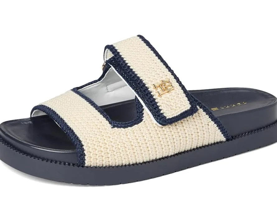 - The Tommy Hilfiger® Landyn isn’t just a sandal-it’s a statement. Featuring an elegant PU upper and woven crochet straps, it brings hand-crafted vibes to your warm-weather wardrobe. Signature Tommy hardware adds a polished pop, while the polyester lining keeps things smooth and breathable. Step into all-day comfort with a contoured leather insole that cradles your feet with every stride. The rubber outsole offers dependable traction, perfect for city strolls or beachside wanderings. With a convenient slip-on design, these sandals are your go-to for effortless style and comfort.
