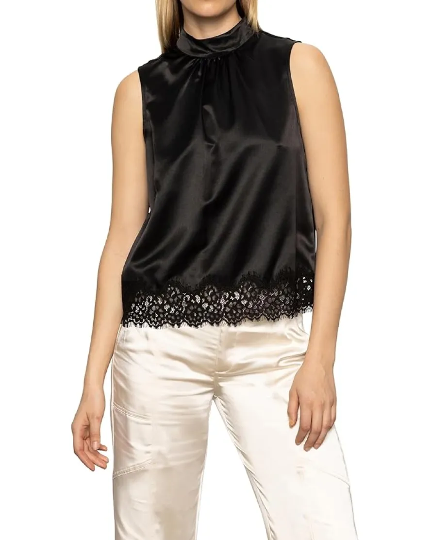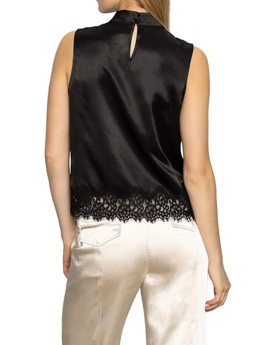 - No matter the occasion, stay flawless in the Sanctuary™ Late Night Satin Tank. Featuring a mock neckline in a sleeveless design, this top offers a back button-and-loop closure with delicate lace trim detailing along the hemline. Pair it perfectly with your favorite skirt or pants and heels for a night out on the town!