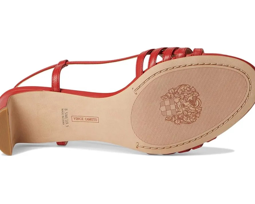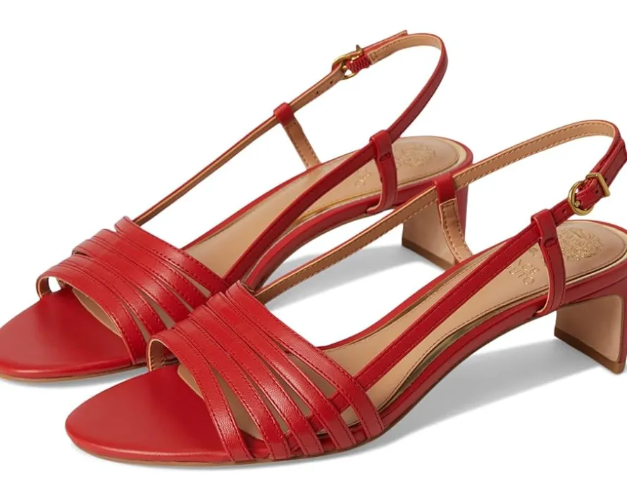 - Slay the day wearing the classy Vince Camuto® Layton Strappy Kitten Heel Sandals. Crafted from leather upper, and synthetic lining, this pair of sandals features open round toe, strappy upper, slingback strap with buckle closure, heel detailing, and padded footbed.