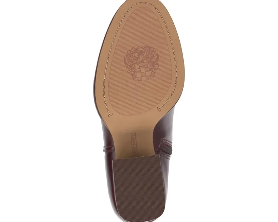 - The knee-high Vince Camuto® Leila tall shaft boot has a modern vintage vibe. With soft round toe and a stacked block heel, this sleek boot has zippered side closure and elastic goring on the shaft for improved fit. The footwear is fabric lined and finished on the exterior with a leather-covered welt and rubber outsole.