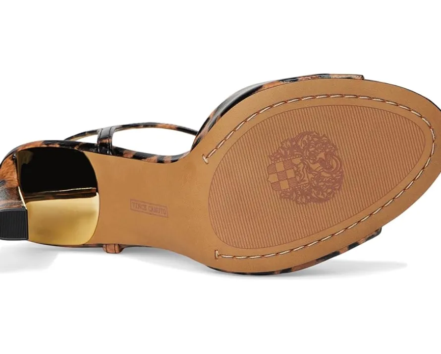 - The Vince Camuto® Lilah Ankle Strap High Heel Sandal offers both style and comfort. Featuring a luxe leather upper, polyester lining, and a padded insole, it offers all-day ease. The block heel and open-toe design exude modern charm, while the delicate adjustable ankle strap ensures a secure, custom fit. Enhanced by sleek gold metal detailing on the sole, this two-piece sandal is your go-to for polished style and reliable comfort, whether you’re dazzling at a soirée or commanding attention at brunch.