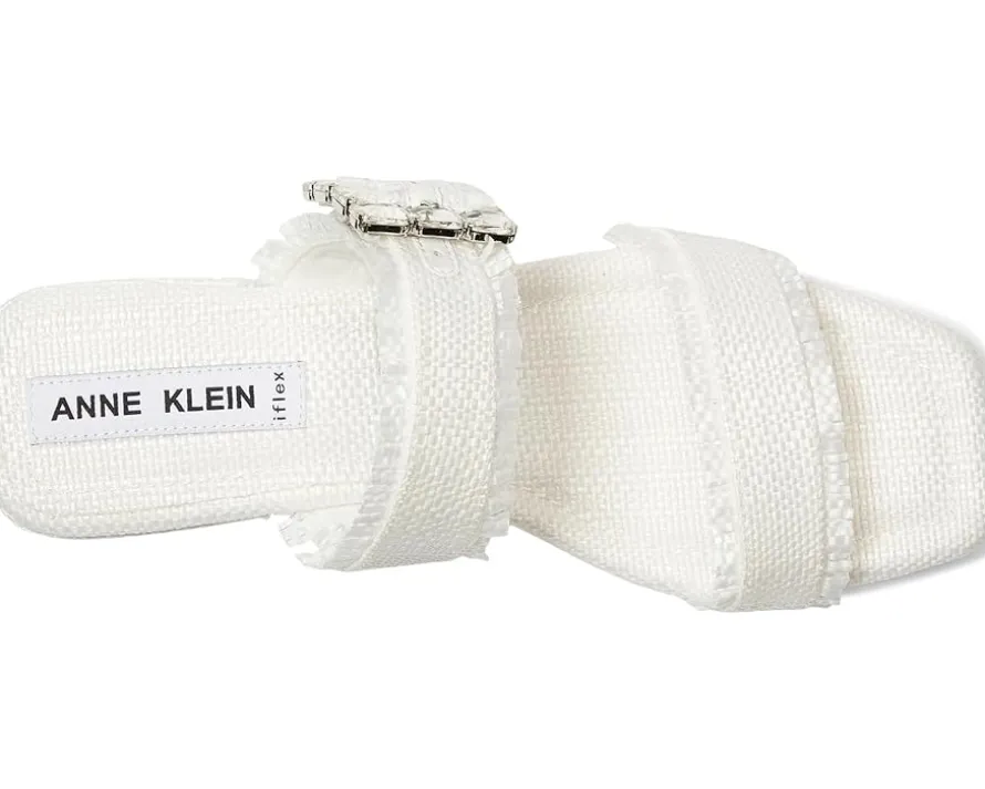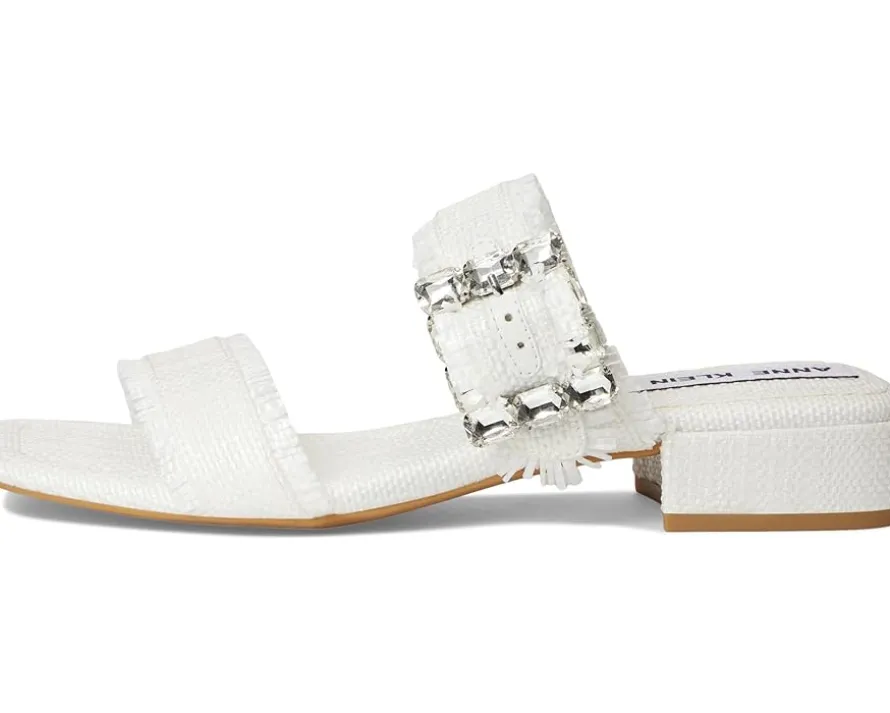 - The Anne Klein® Lillie slip-on sandal is perfect for elevating casual looks or adding a polished finish to dressier outfits. This two-banded open-toe sandal features a chic square toe shape and a dazzling crystal buckle detail that adds just the right amount of sparkle. The frayed edges lend a trendy, fashion-forward touch, while the low block heel ensures comfort without compromising on style.