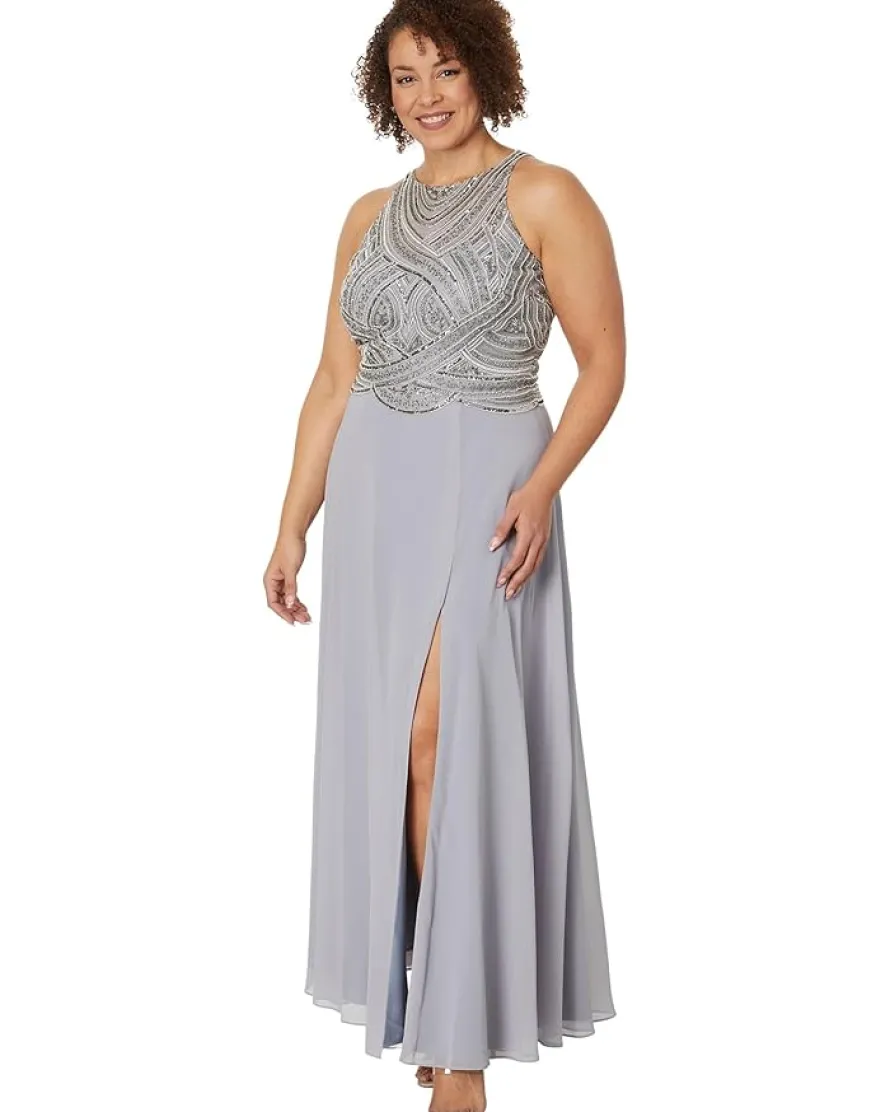 - Shine elegantly in a crowd wearing Betsy & Adam™ Long Metallic Beaded Top. It features round neckline, sleeveless design, and allover beaded embellishment that give the top a sparkling dazzle. A floor-length drop with front slit and center-back zipper closure flaunts your curves sensuously.