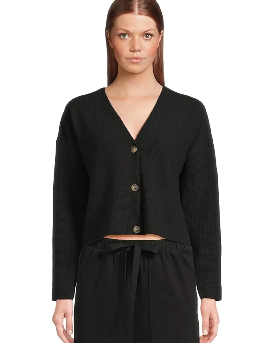 - Designed with a clean facing around the neck and placket for a refined look, the Lilla P™ Long Sleeve Cardi is comfortable, versatile, and effortlessly chic. Its Textured Waffle fabric offers a perfect blend of comfort and coziness. It is styled with long sleeves, dropped shoulders, a deep V-neckline, and a straight hem. The buttoned front closure ensures easy wear. This button-down sweater pairs effortlessly with the coordinating waffle pants or any higher-waist bottoms.