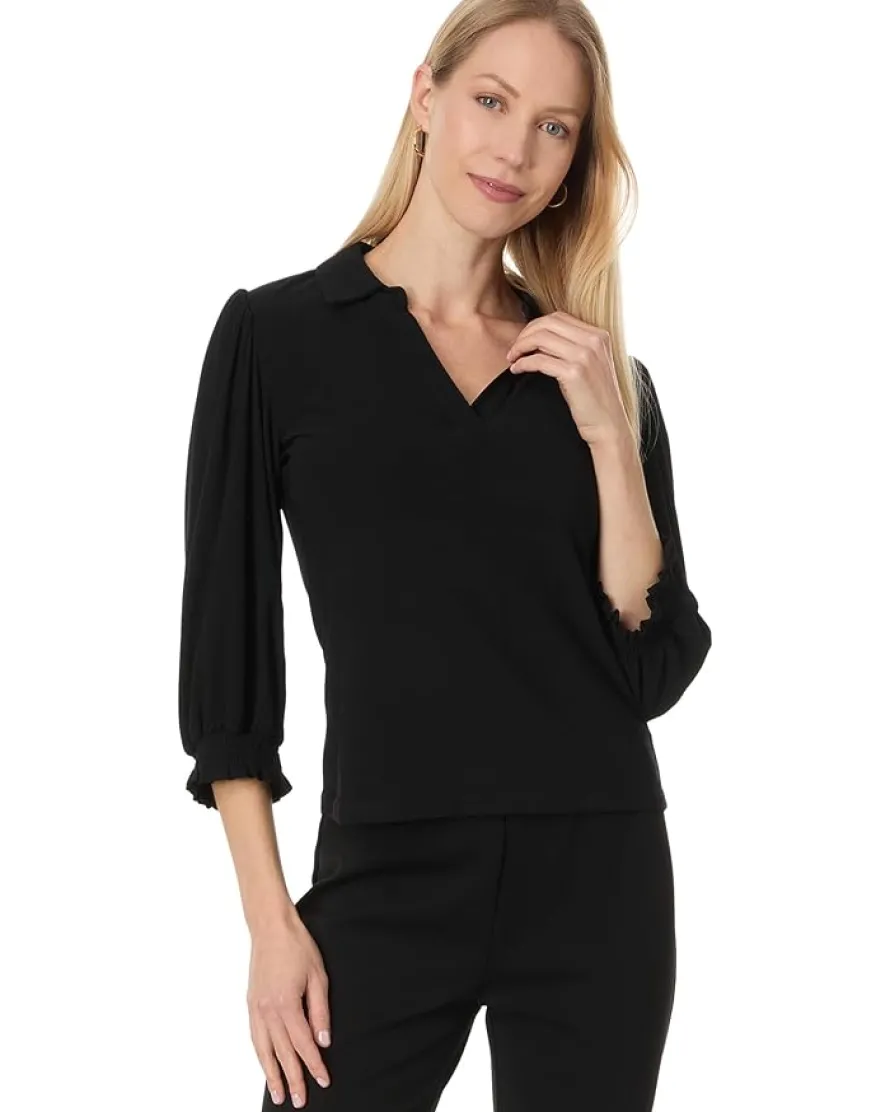- Add a touch of refinement to your everyday ensemble wearing CeCe™ Long Sleeve V-Neck Blouse W/Smocking Cuff. The classic V-neck and pull-on design offer a timeless silhouette, while the smocked cuffs add a chic, modern touch that complements any occasion. Crafted with exquisite attention to detail, its classic fit flatters every figure, making it a versatile staple for work, casual outings, or special events. Delicate foil accents enhance its understated charm, ensuring you’ll feel polished and stylish with every wear.