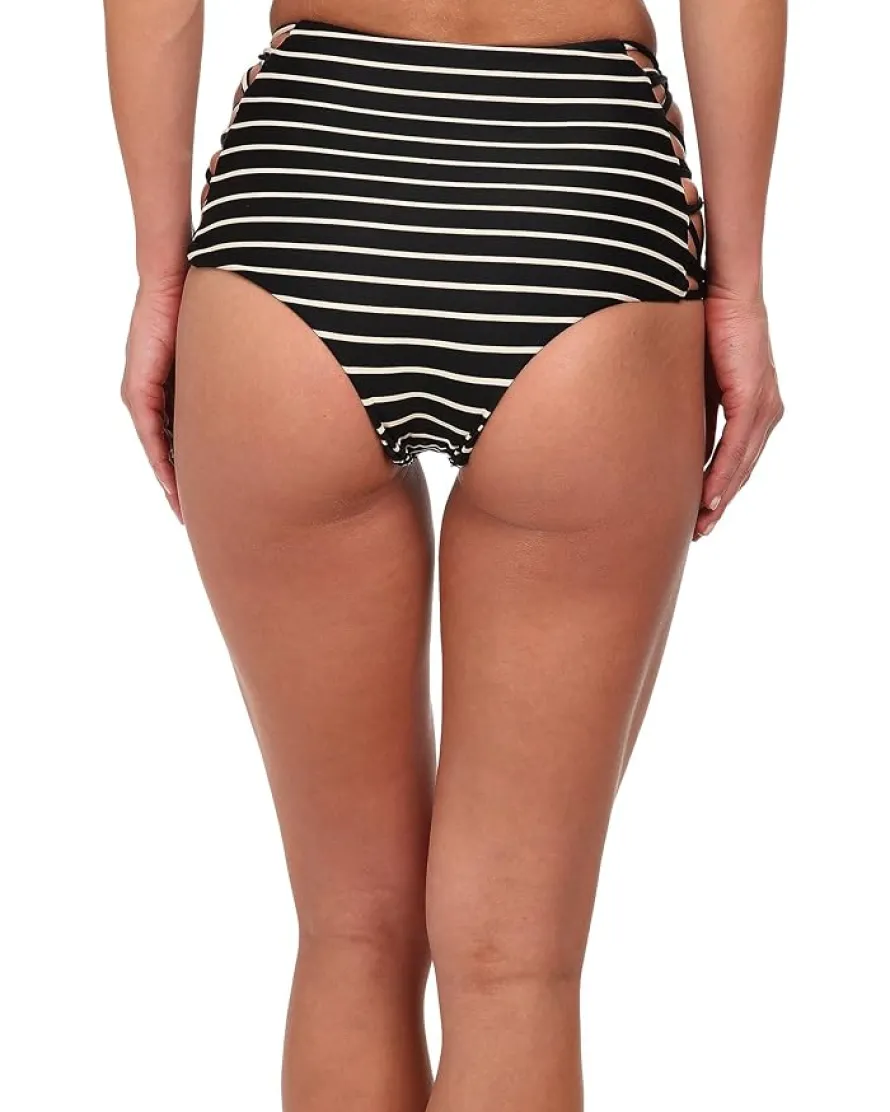 - High-rise bottom flaunts crossing string cutouts at sides for a sultry style.
