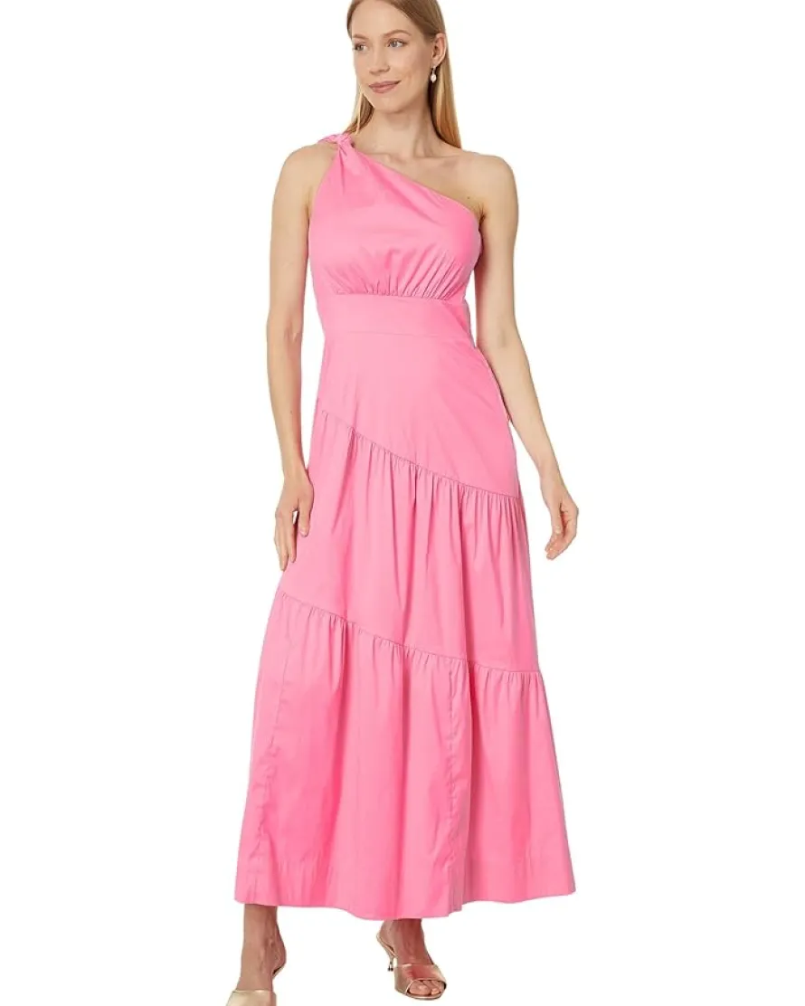 - Flaunt a radiating glow donning Lilly Pulitzer® Lucilyn One Shoulder Cott Dress. The maxi dress features a fit-and-flare silhouette, one-shoulder design with knot detail at shoulder, concealed side zipper closure, a vibrant solid pattern, and asymmetrical hem tiers.