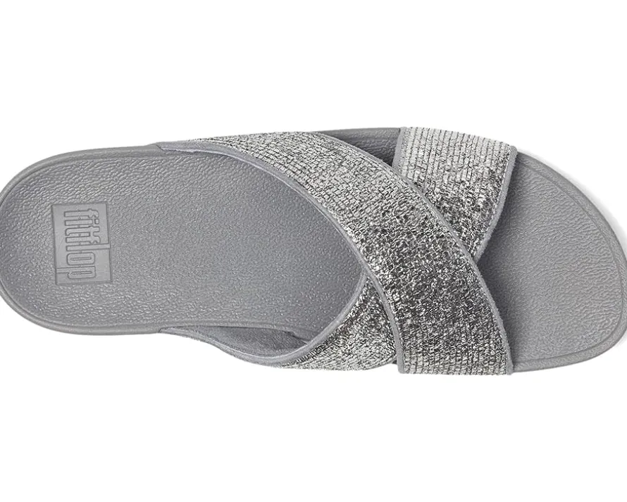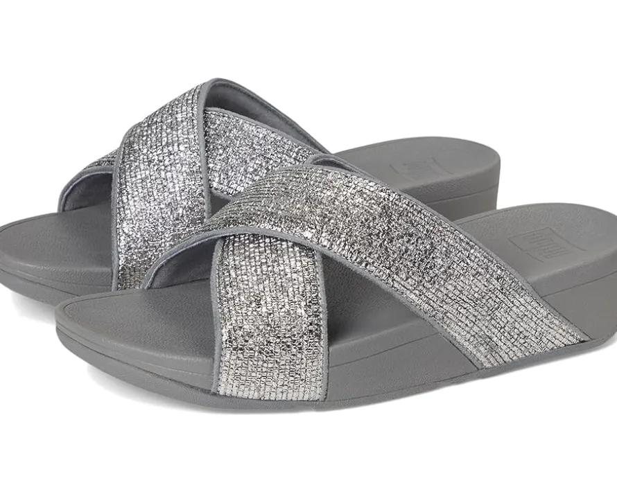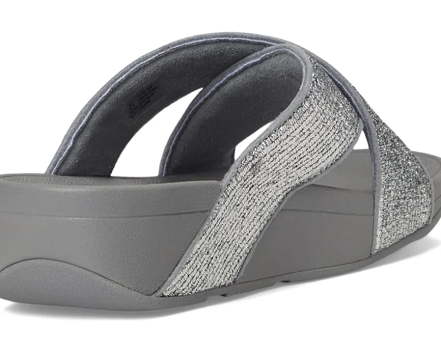 - The FitFlop™ Lulu Crinkled-shimmer Cross Slides are the classics. Perennially popular, they’re softly padded, foot-flattering, and on FitFlop’s Microwobbleboard™ midsoles for unbeatable all-day comfort. This season, crafted in a glittering crinkled-foil polyurethane upper, these slides are an irresistible mix of shimmer and texture. They are styled with tonal piping. Their rubber insole and polyester lining offer added comfort. These slide sandals are ergonomically engineered to help optimize your body’s alignment, natural movement, & energy. APMA-accepted, they offer natural arch support and are grip-suited to everyday use/road tread. Simple but glitzy, these slip-on sandals are equally good whether you’re doing daytime glamour or headed to a party.