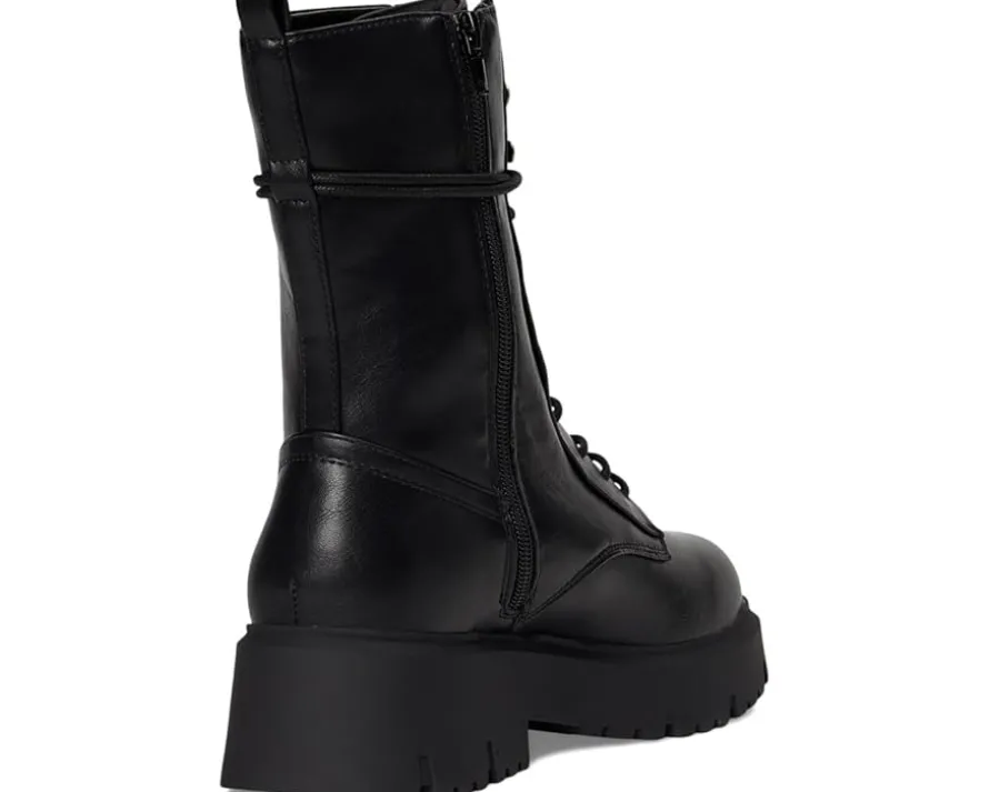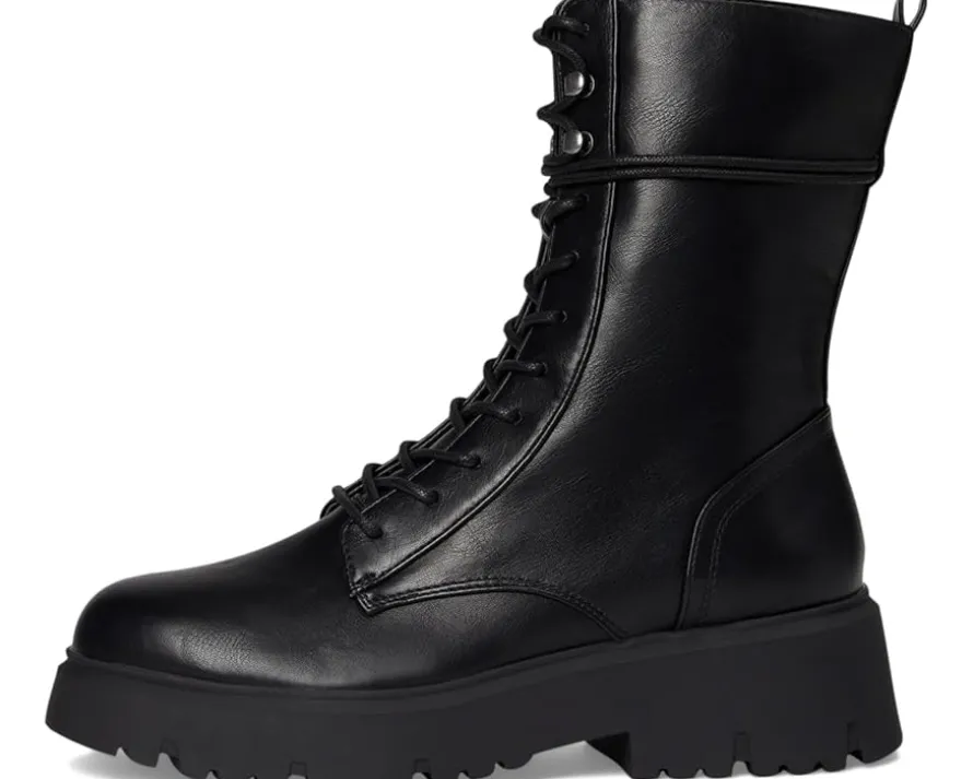 - The Madden Girl Maisey combat boot is cool girl approved with its lug sole. Crafted from a faux leather upper, these boots offer a lace-up closure in a round toe silhouette, side zipper, faux leather lining, and a faux leather insole.