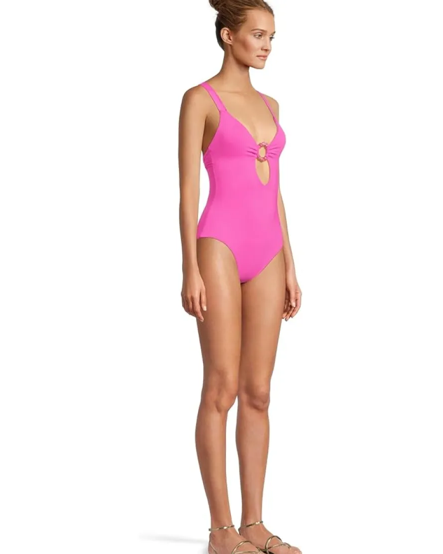 - Swim strong and look attractive wearing the BECCA® Marble Canyon Ariyah Ring One Piece. Featuring plunge neckline, crisscross back with tie closure, sleeveless style, gold ring with dyed to match marbleized stones, and removable cups.