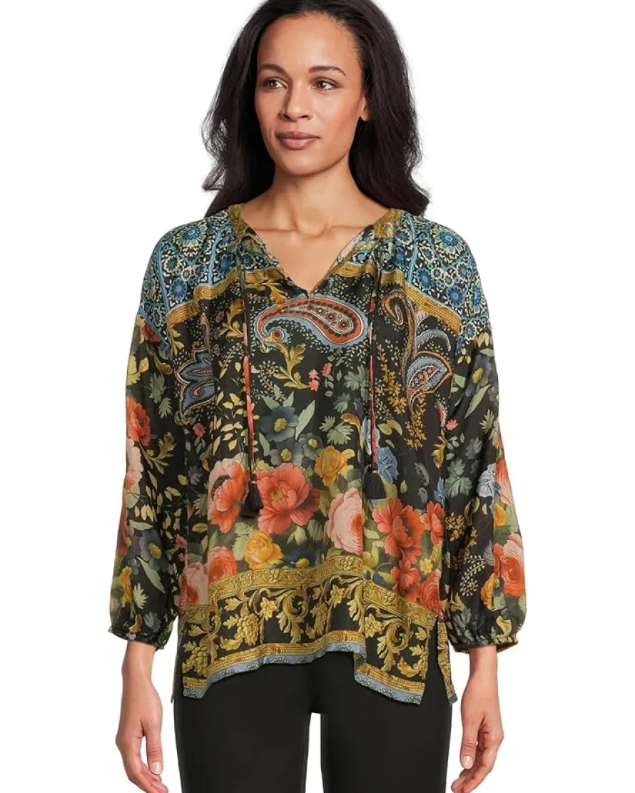 - Boho-chic vibes meet effortless elegance in the Johnny Was® Margot Blouse. Designed to make a statement, this Margot Blouse is embellished with a bold, ornate pattern that turns everyday dressing into an art form. Featuring a split V-neckline with a drawcord tie, it offers versatile styling; wear it tied for a polished look or left open for a laid-back, breezy feel. Drop shoulders and bishop sleeves add a touch of romantic drama, while the relaxed-fit bodice creates an airy silhouette perfect for layering or wearing solo. With its easy pull-on design and lightweight flow, this blouse blends comfort with sophistication, making it the ultimate piece for dressing up your casual days or adding flair to your evenings.
