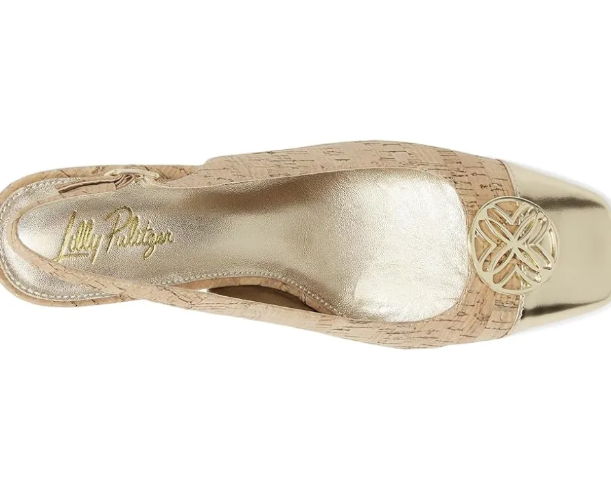 - Metallic cork slingback with soft square mirrored leather toe, gold metal logo hardware detail and cork with mirrored leather block heel. 5mm LP Plush padded footbed.