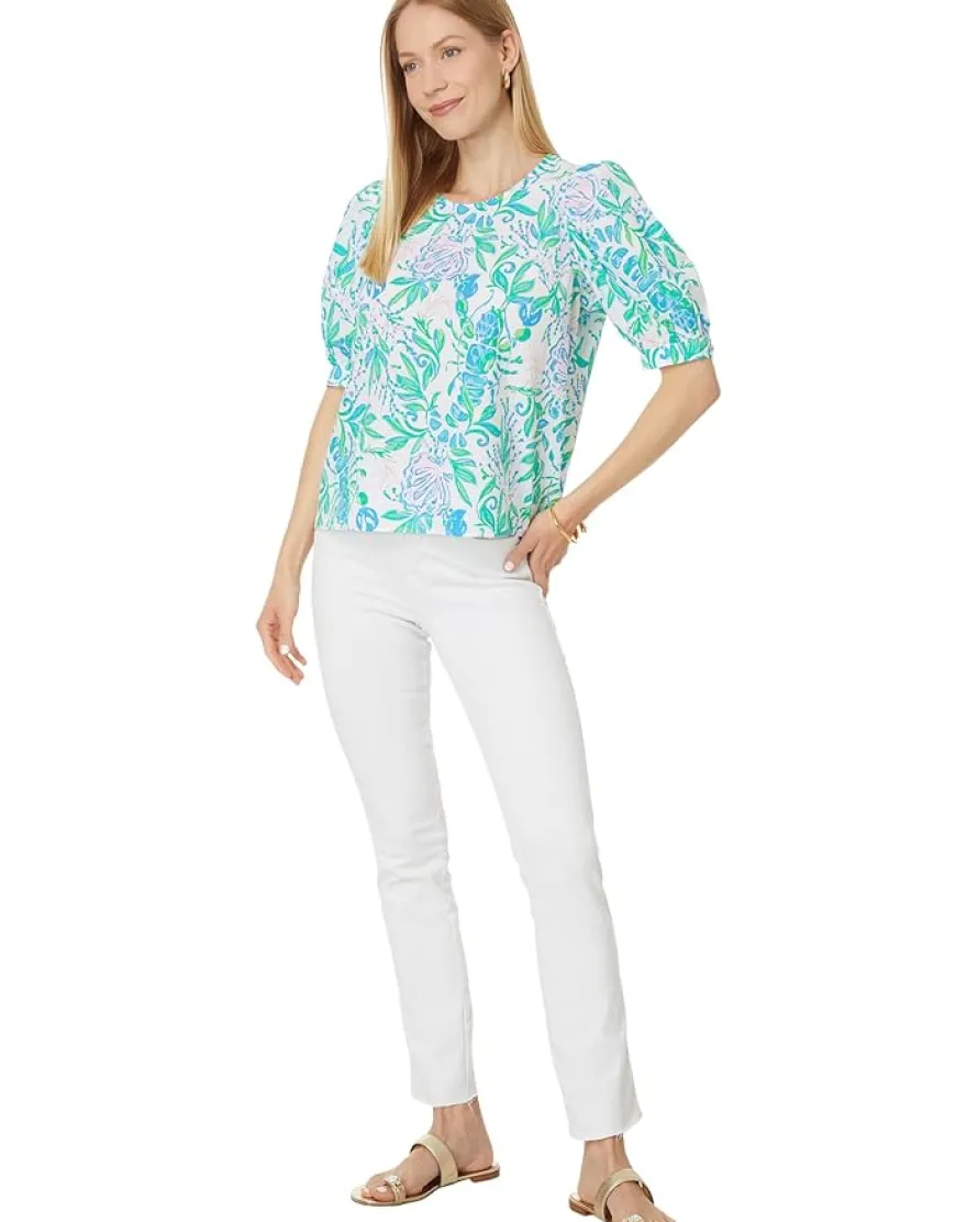 - Floral fantasia: effortless chic wearing Lilly Pulitzer® Masieleigh Short Sleeve Cotton Top. Embrace the vibe with an easy fit and crew neck, perfect for any occasion. Say hello to comfort with elbow-length sleeves for a touch of flair. Classic floral print adds timeless charm, while the pull-on design ensures convenience without compromising style.
