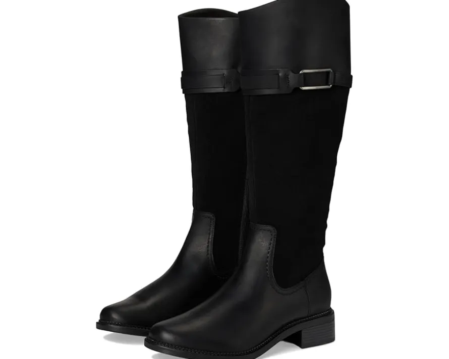 - Add an eye-catching appeal to your outfits with the Clarks™ Maye Carly boots. The polyester insole and mesh lining of these boots keep your feet cool and comfortable. These knee-high boots are made of a leather upper that features a zippered side closure and a buckle detail. Stylish and durable, these hiking boots make a great addition to your footwear collection.