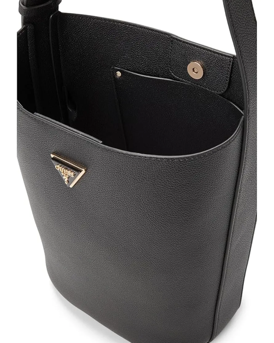 - The GUESS® Meridian II Bucket bag blends modern style with everyday function. This trendy bag is made from high-quality double-faced pebble polyurethane material, giving it a sleek and sophisticated look. The magnetic snap closure ensures your belongings are safe and secure, while the adjustable shoulder strap allows for comfortable wear. And with a removable zippered pouch featuring a detachable shoulder strap, you can easily transition from day to night with this versatile accessory.