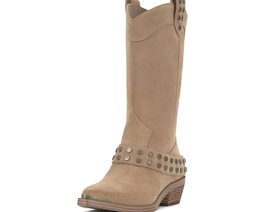 - This mid-calf western inspired boot comes in rich leather and silky suede. With traditional pull straps adorned with circular hardware and extended welt with metal tip to protect the toe, the boot also has a less traditional belt detailed with hardware and inside zip for easy entry. With a flattering curved topline, the boot sits on a stacked 1.4 in heel.
