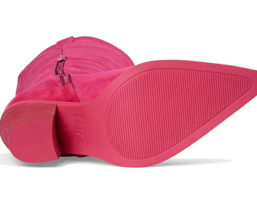 - Stand tall, stride boldly, and own every moment in the MIA™ Messini boots. Designed with a luxe faux suede upper and a smooth faux leather lining, these knee-high stunners are made to steal the spotlight. The round toe keeps it classic, while the block heel gives you the perfect lift without compromising comfort. Featuring the MIA Signature Footbed™ and cushy foam insole, you’ll feel supported with every step from day to night. A side zipper ensures the perfect fit, while pull tabs make slipping them on effortless. Choose timeless beige for everyday chic or a daring bold print to make a statement; either way, you’ll be turning heads. Finished with a durable synthetic rubber outsole for stability, Messini is where fashion meets function.